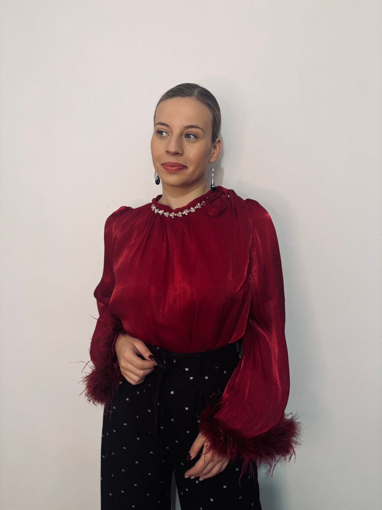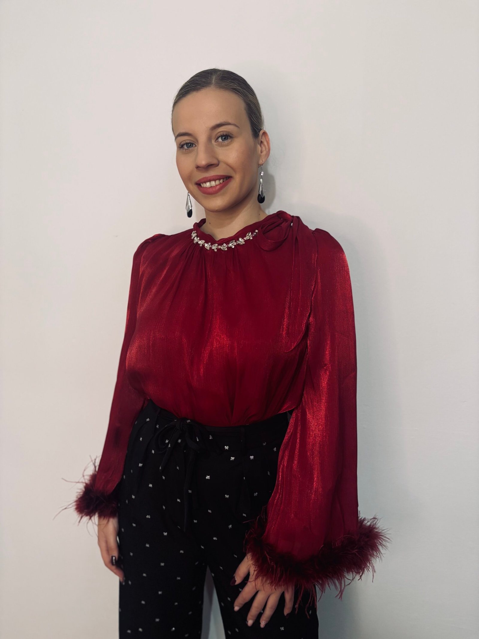 Esta prenda es el máximo exponente de la elegancia moderna. Nuestra blusa con plumas en las mangas combina un intenso color rojo con un brillo sutil en el tejido, creando una pieza sofisticada ideal para eventos, cenas o fiestas donde quieras ser la protagonista. El detalle plateado en el cuello añade un toque de luz que elimina la necesidad de accesorios adicionales.