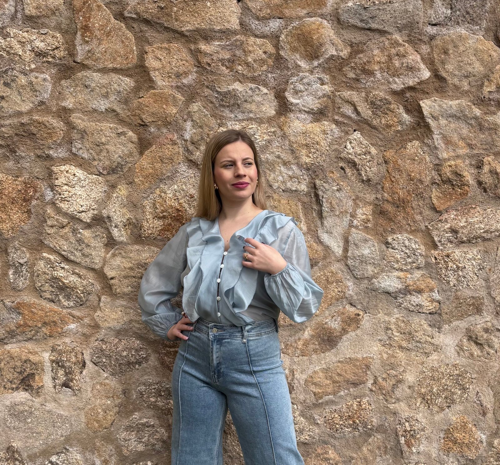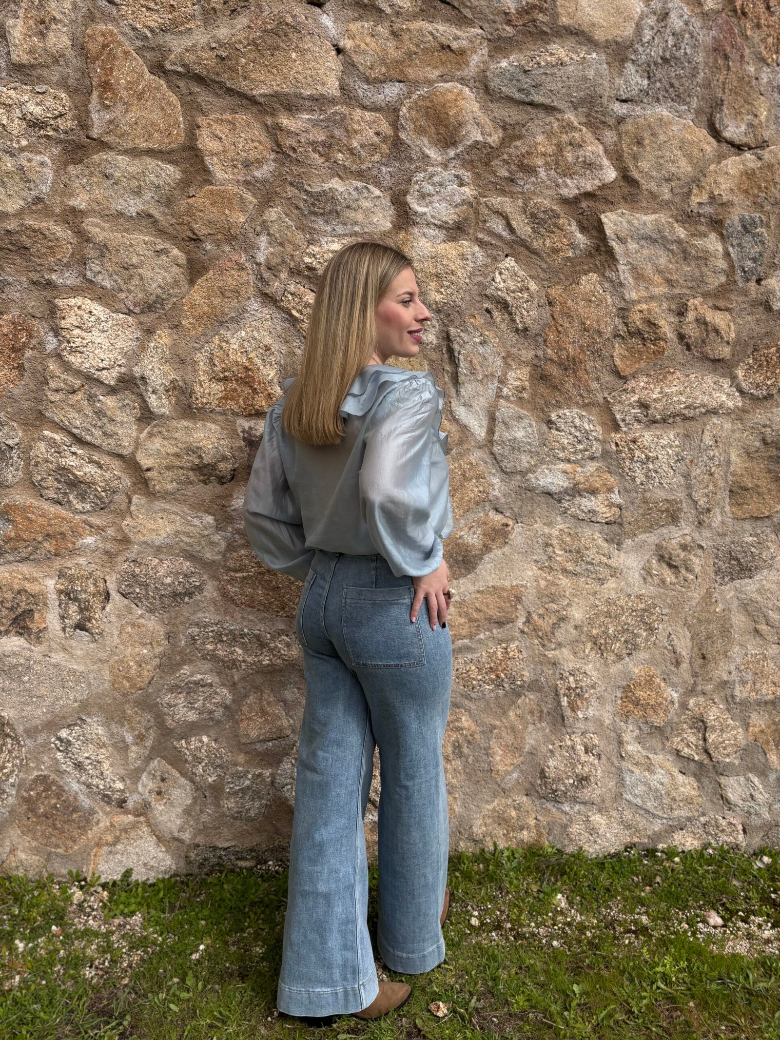 Blusa de volantes con escote y botones en la parte delantera. Talla única (36/38/40).