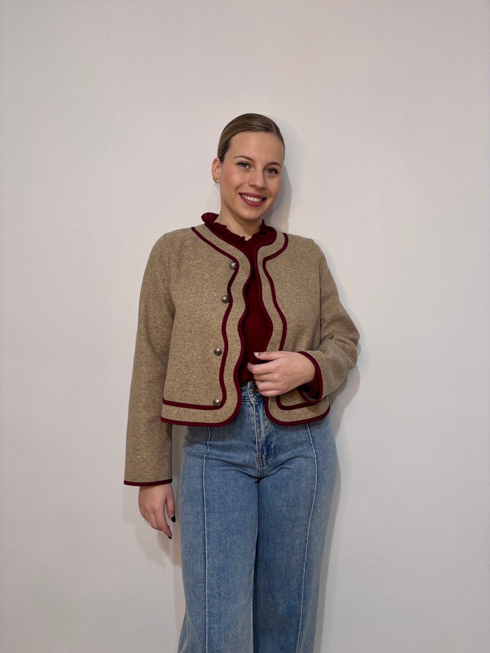 Chaqueta con bordes en color burdeos. Talla única (36/38).