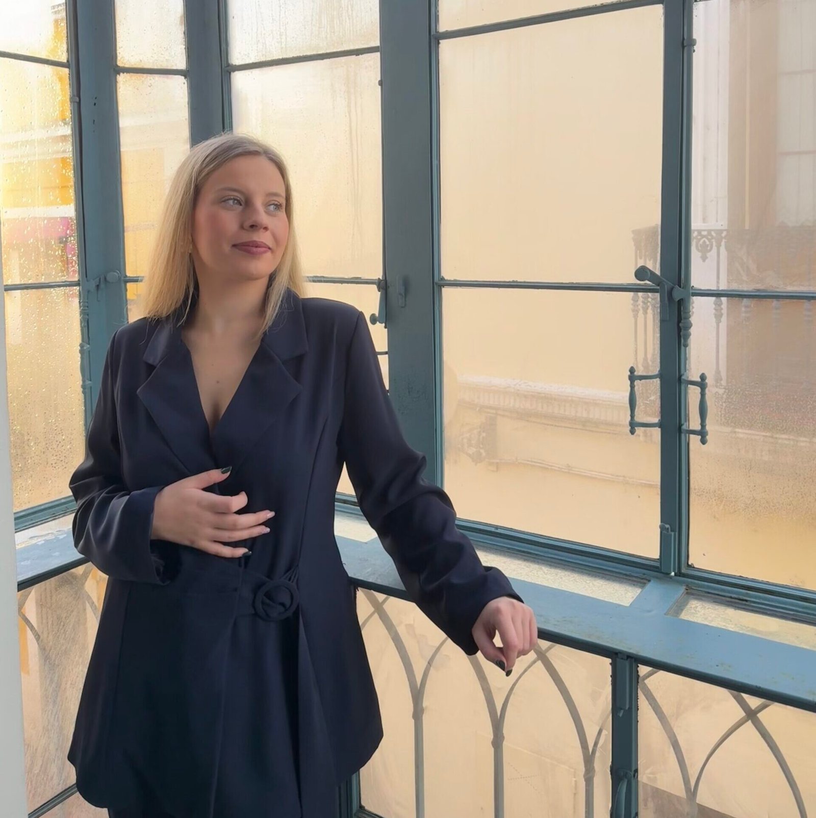 Este conjunto es la personificación del estilo «business chic» con un giro moderno y femenino. Nuestro conjunto traje mujer azul marino destaca por su profundo tono azul noche y una confección impecable que equilibra la estructura de la sastrería clásica con detalles de diseño únicos.