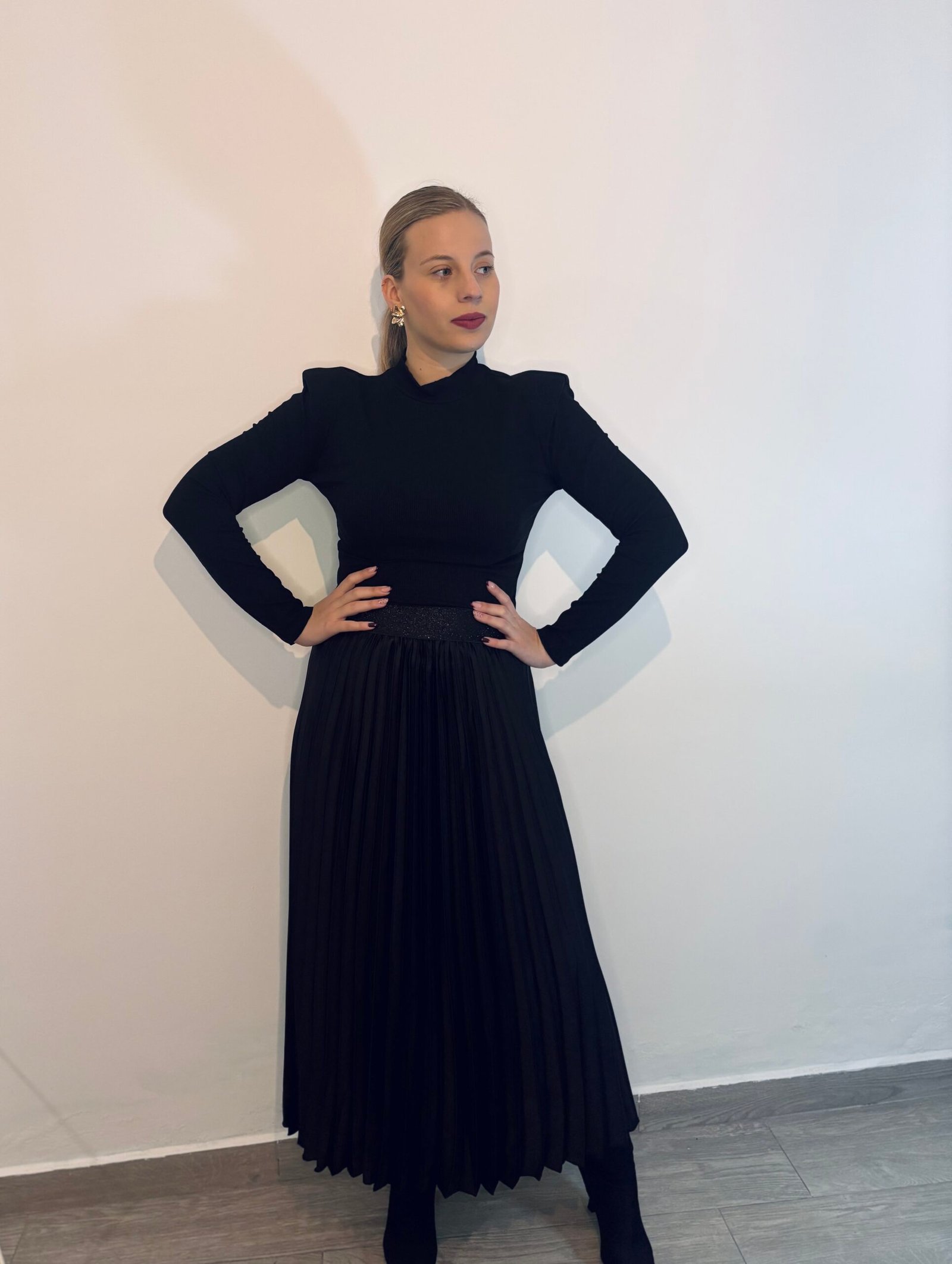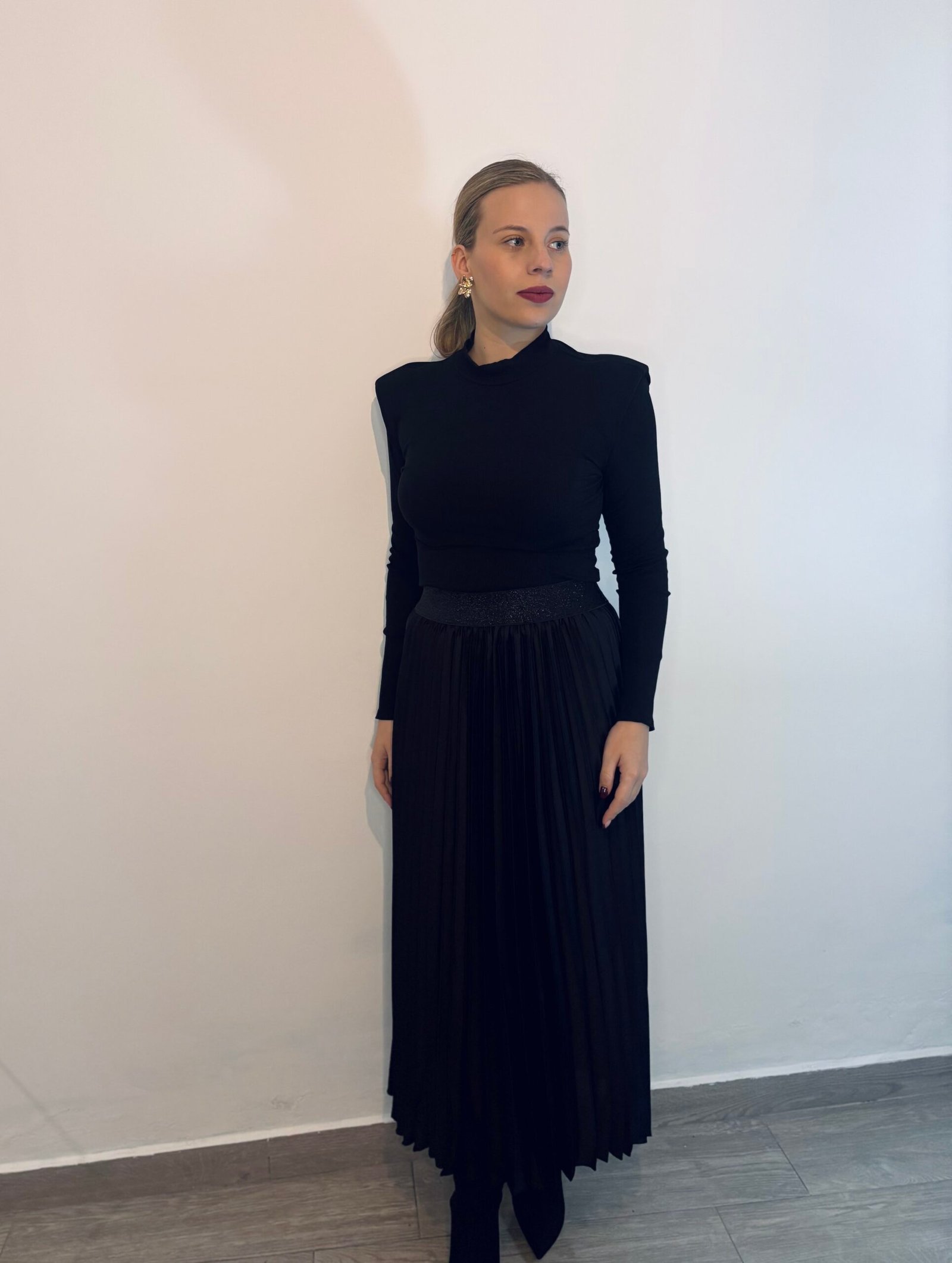 Esta prenda es el equilibrio perfecto entre comodidad y sofisticación. Nuestra falda larga con pliegues destaca por su tejido fluido de alta calidad que crea un movimiento elegante y vaporoso al caminar. Su diseño en color negro profundo la convierte en una pieza extremadamente versátil, capaz de adaptarse tanto a looks de diario como a eventos más formales.