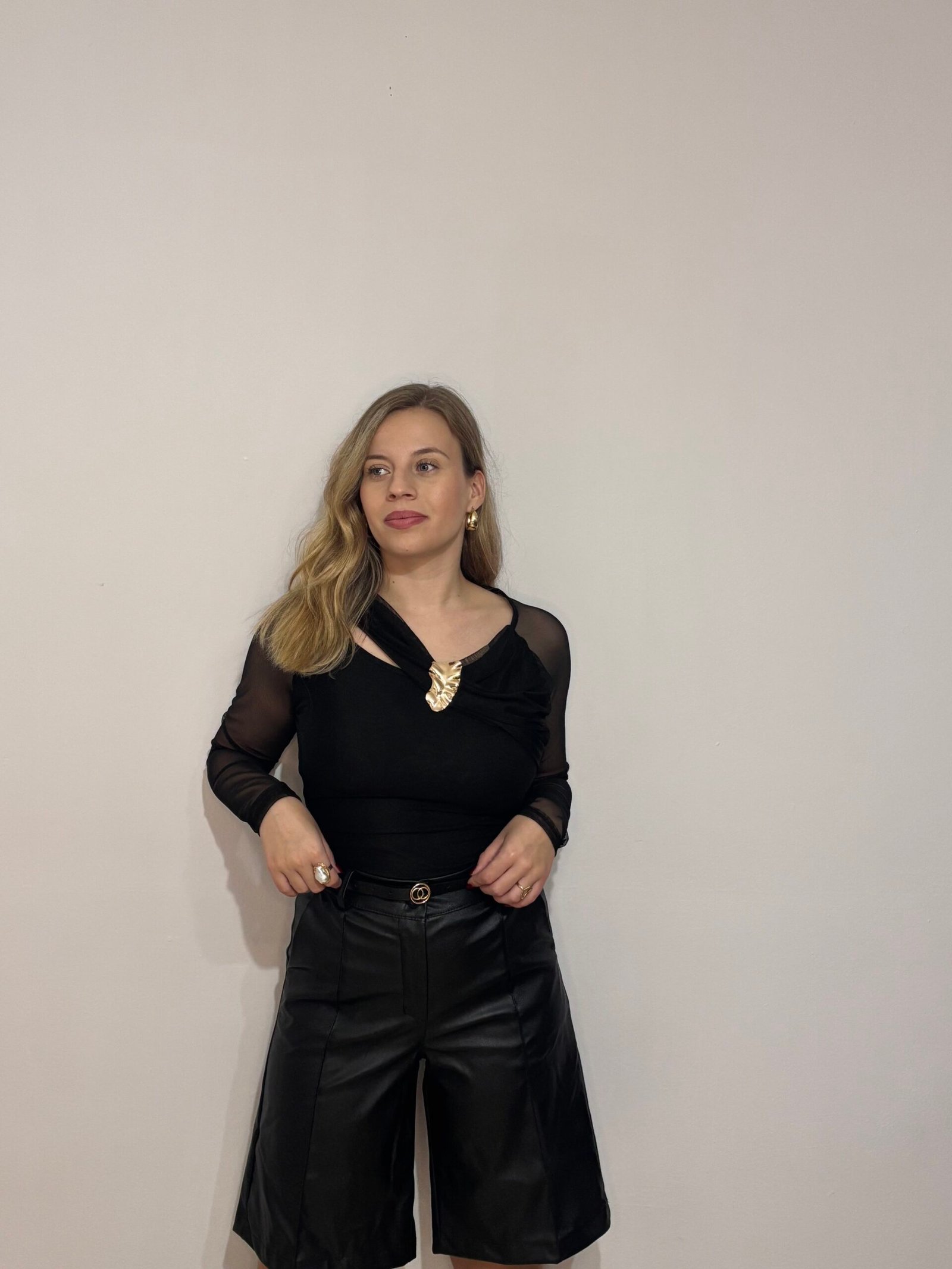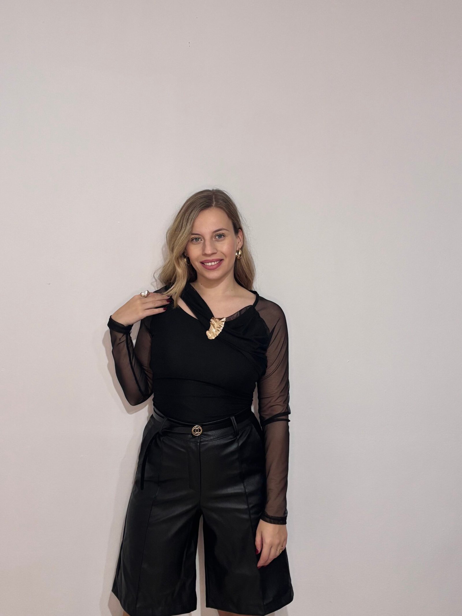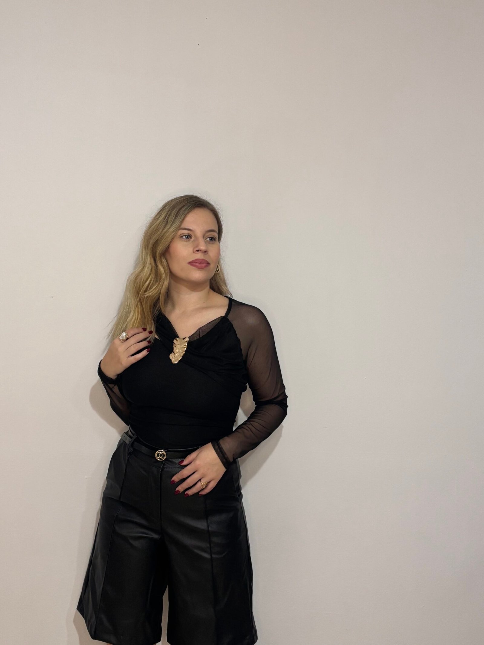 Esta prenda es la definición de elegancia nocturna y sensualidad refinada. Nuestro top negro con transparencias mujer destaca por un diseño sugerente y chic que combina un cuerpo opaco con mangas y una espalda completa en gasa transparente. El punto focal de la prenda es su espectacular broche dorado en el escote, que aporta un brillo de lujo y elimina la necesidad de accesorios adicionales.
