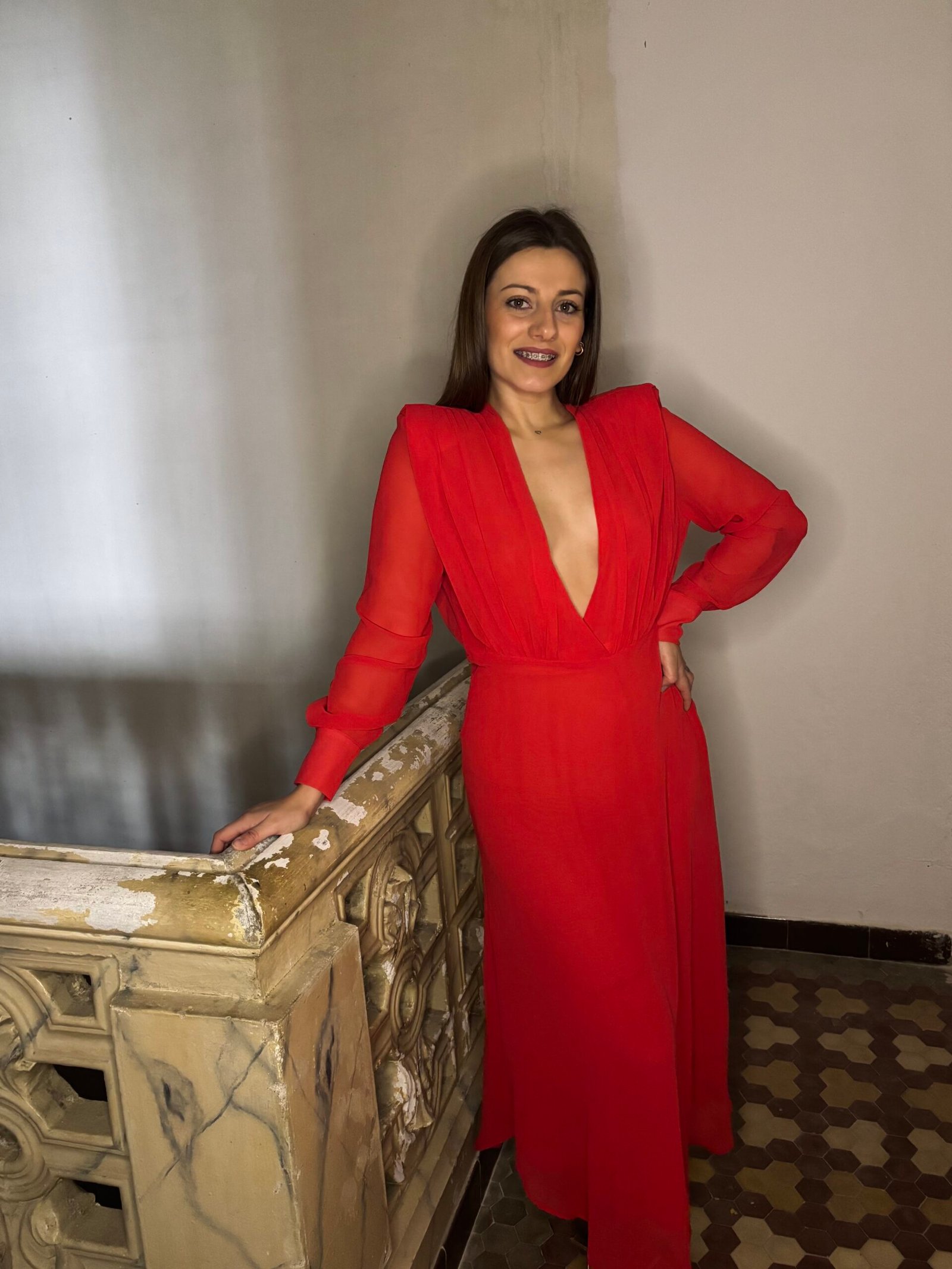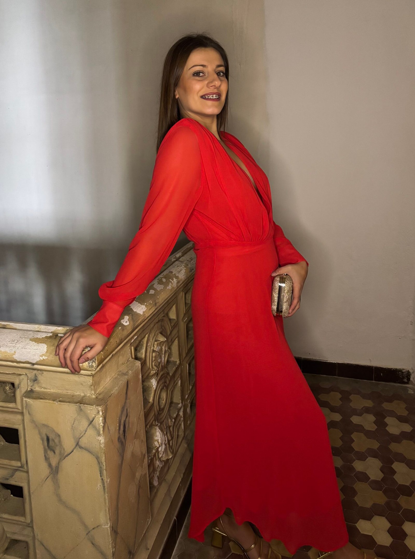 Vestido de fiesta en color rojo. Tiene escote muy abierto y hombreras. Su tejido es de gasa. Muy elegante, ya sea para un evento de día o de noche