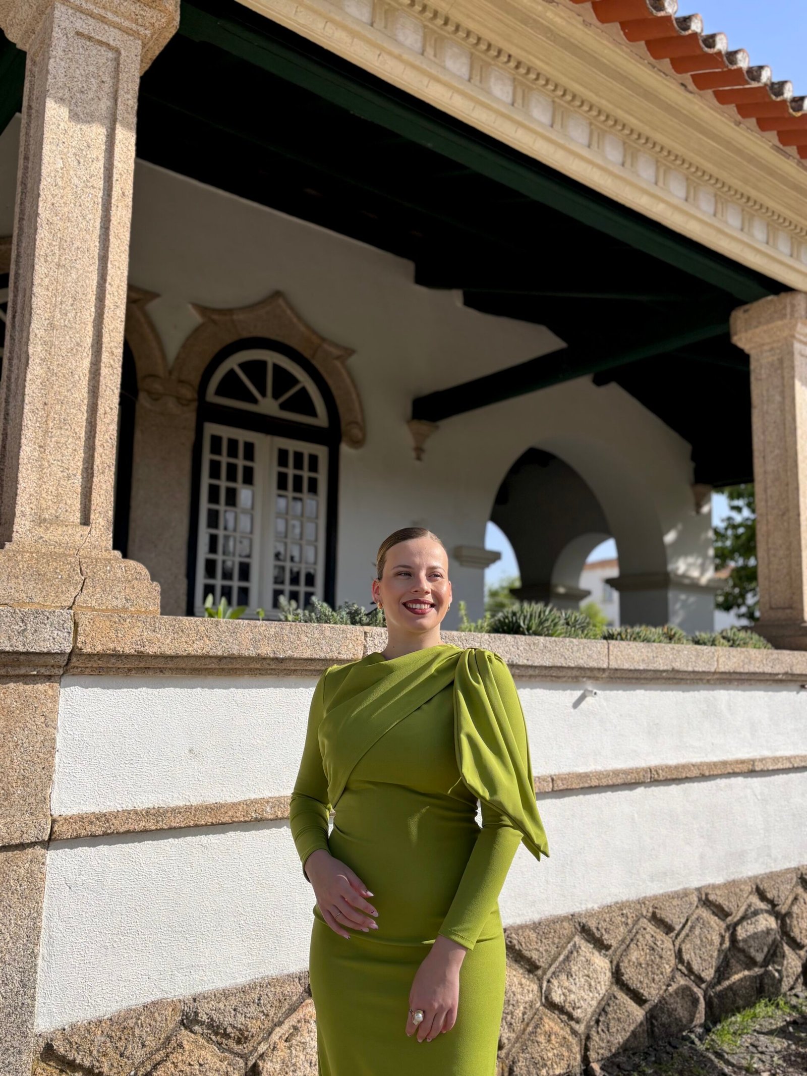 una pieza de diseño contemporáneo que combina una silueta entallada con detalles de drapeado artístico. Su tono verde lima y su sofisticada manga asimétrica lo convierten en la opción definitiva para invitadas que buscan marcar la diferencia con elegancia.